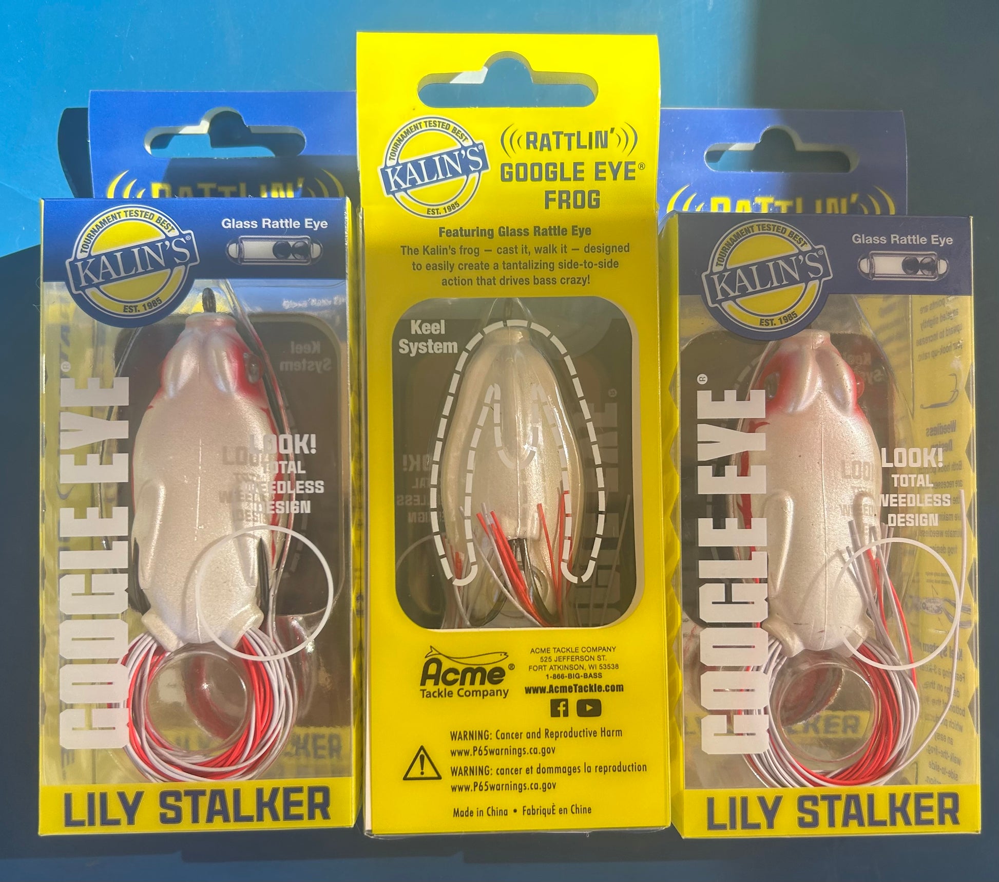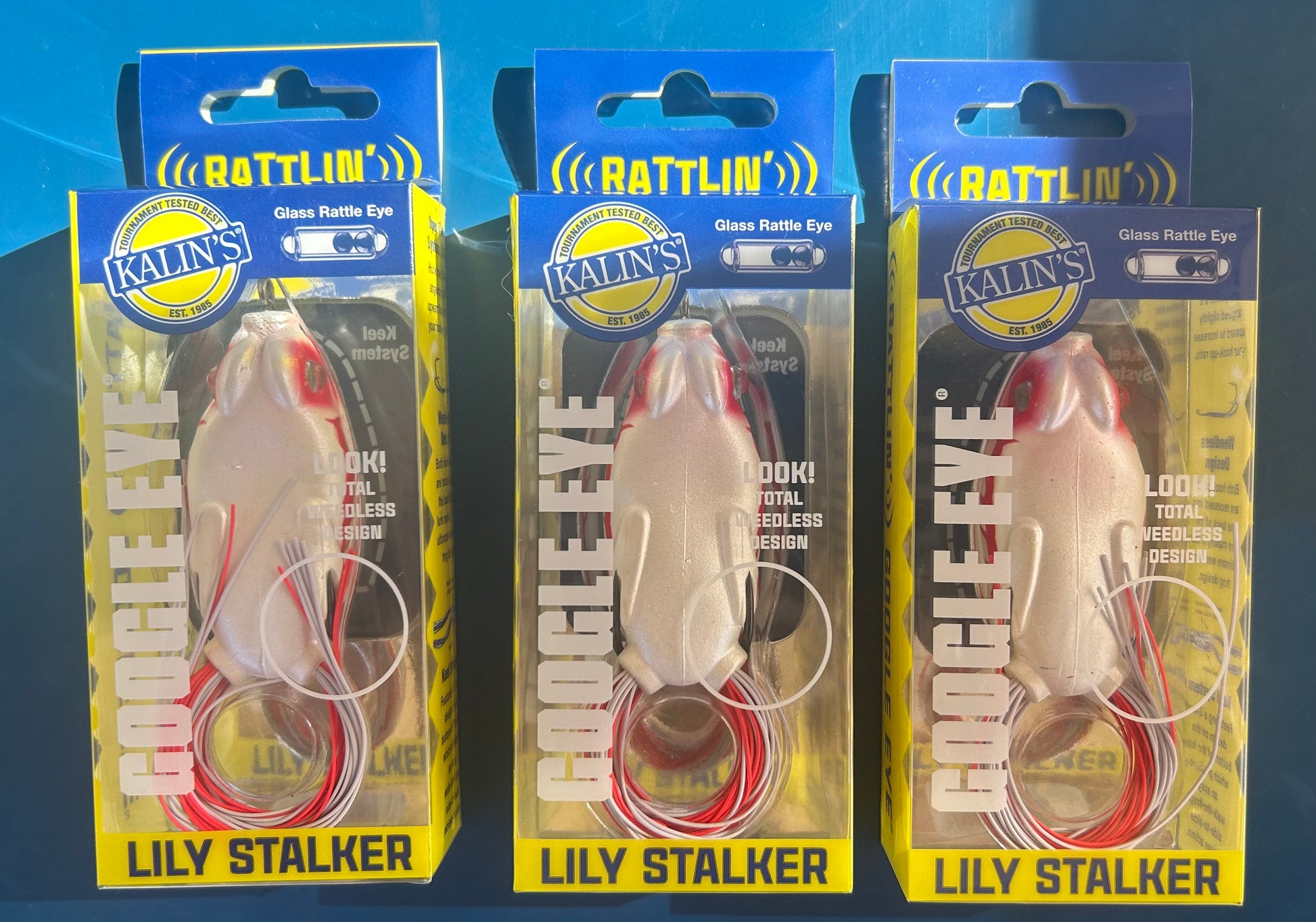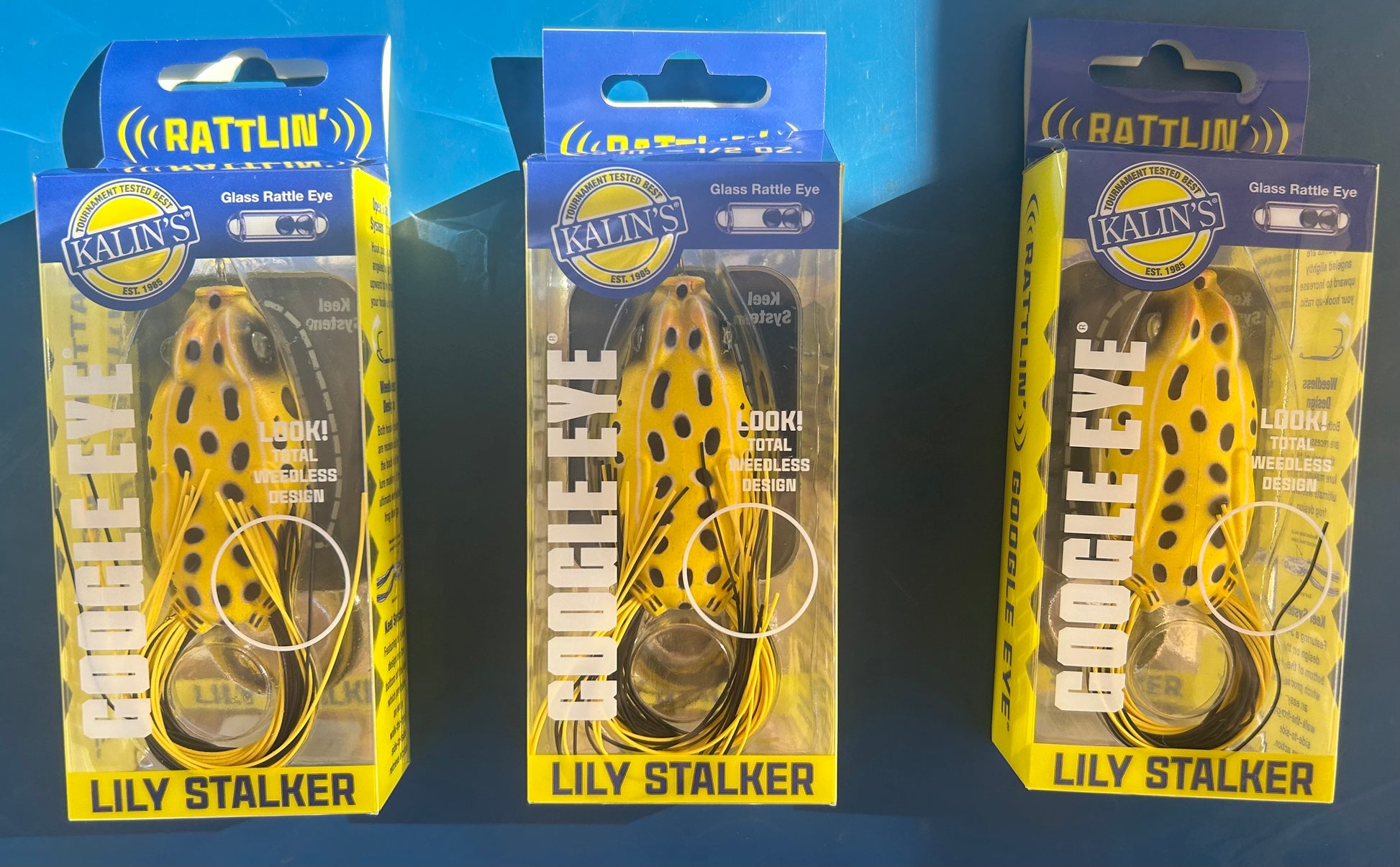 The Kalin’s Rattlin Google Eye Lily Stalker Frog provides the profile and action that puts big fish in the boat. Featuring a patented built in google eye glass rattle system, the Kalin’s Rattlin Google Eye Lily Stalker Frog produces a very loud acoustic presence in the water that calls in the biggest bass through the thickest of cover. It also features a three-keel system on the bottom that keeps the frog in a perfectly horizontal posture on the surface for easy walk-the-dog action in open water.