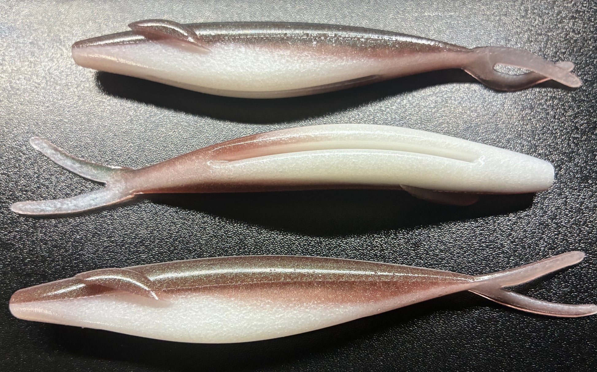 Scorch Winged Minnow / Shad baits- This "Winged Shad style" bait measures 5 inches from nose to tail. The winged flat tail minnow features a deep hook slot to allow great hookup ratios. The back features a divot down the center to align and hide your hook point. This bait has a darting action with its long thin fork-tailed profile and winged head. The winged shad draws in the bass as it replicates a dying food source. Similar to the Sakamata Shad and Winged Fluke.